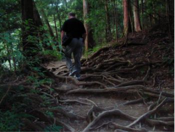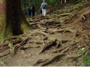 『木の根道』 岩盤が固く地下に根が張れない過ぎの根が見事なアラベスク模様を描く。