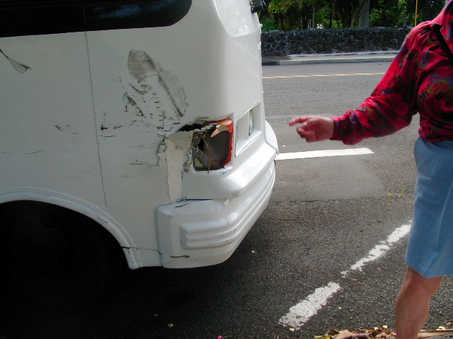 相手のドライバーが車のドアを開けようとしたところ、我々のバスが ぎっーと、横切ったわけで、おかげで バスの右前方は、このように・・・